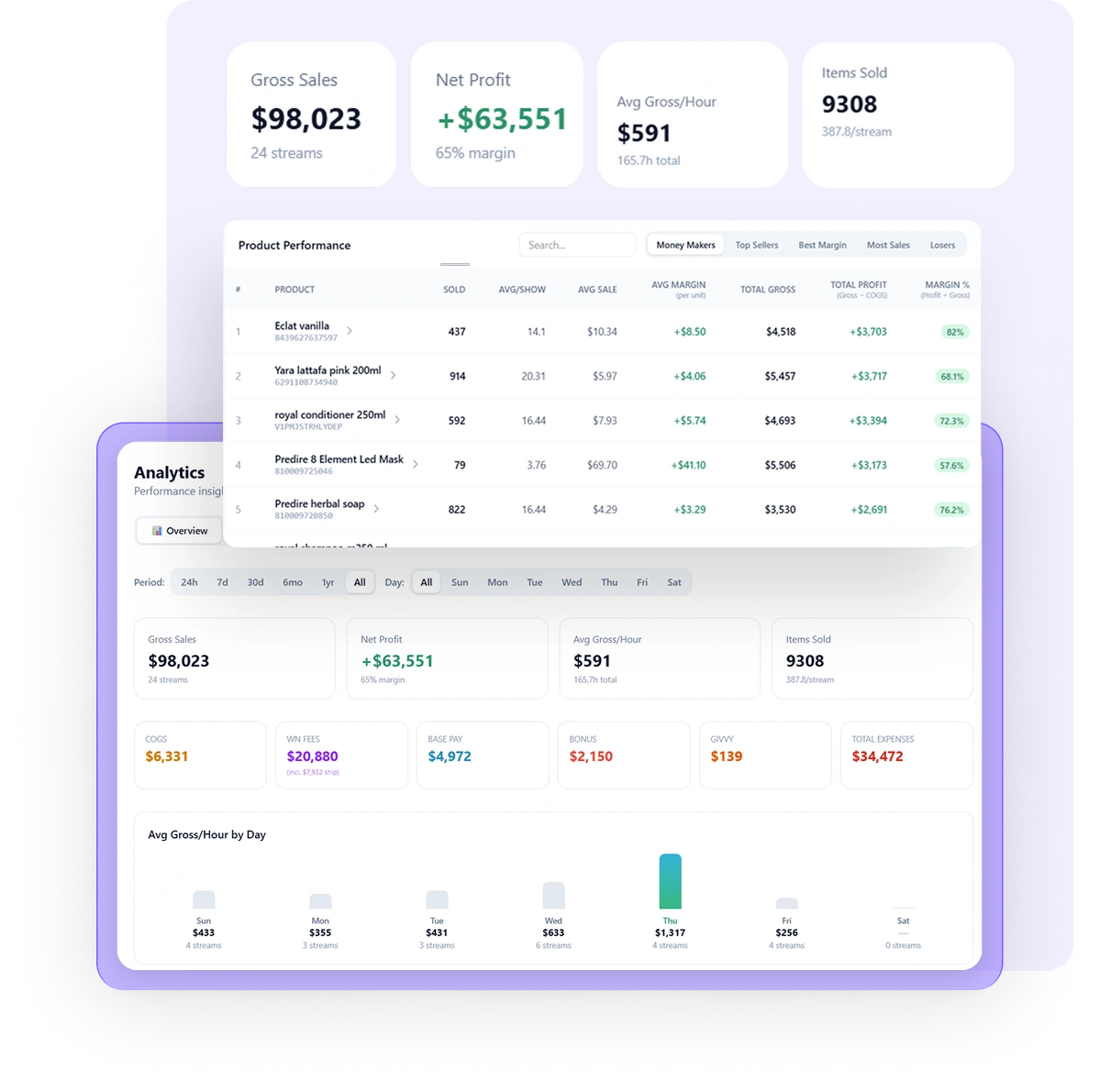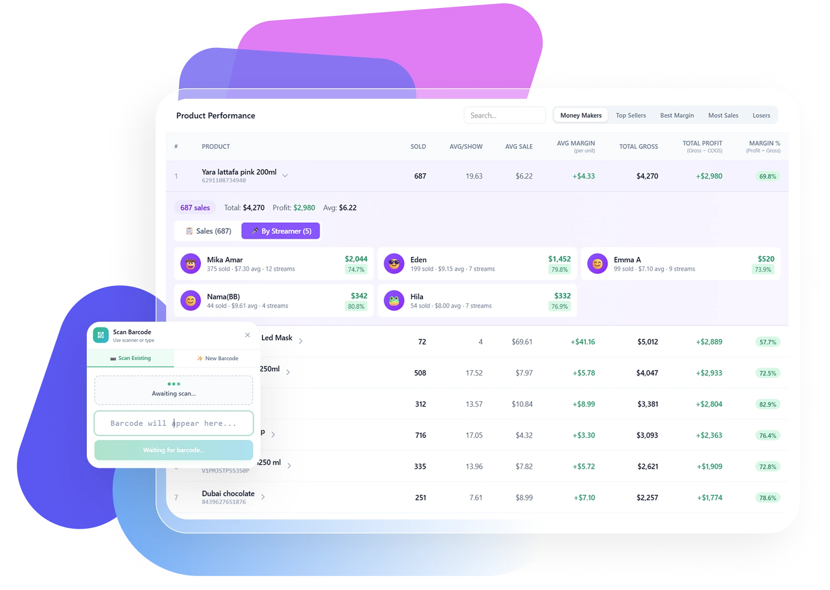 Get complete visibility into your livestream business from every angle. See which products are most profitable (and by how much), which products lose money, and how performance changes by stream, day, and time so you know exactly when margins rise or drop. Drill into historical product data to track results over time, then break it down by streamer to see who sells each item best and at what profit.