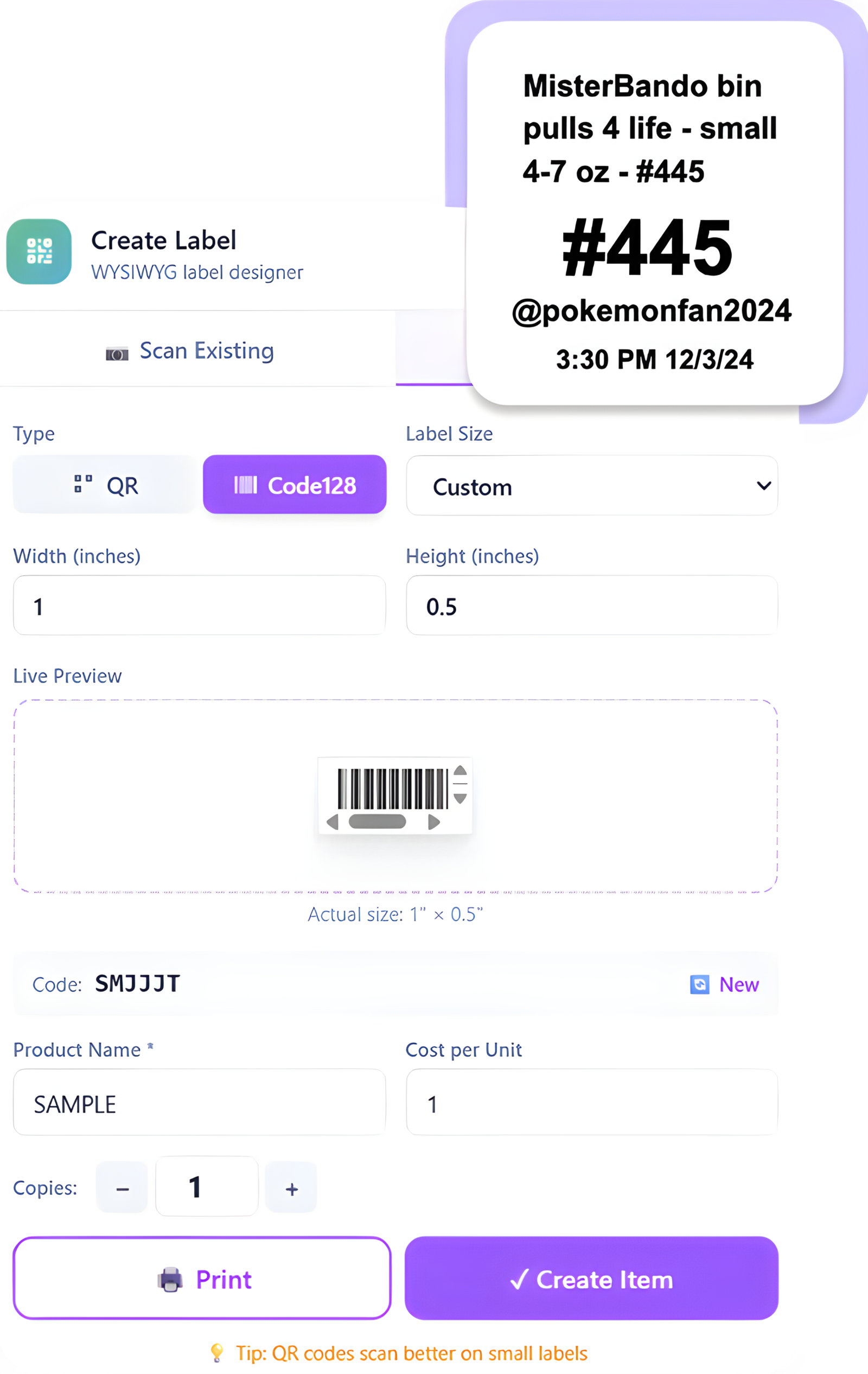 Smart labels auto-print after each sale with the show, streamer, and exact item number. Generate custom barcodes for any item so everything stays trackable.