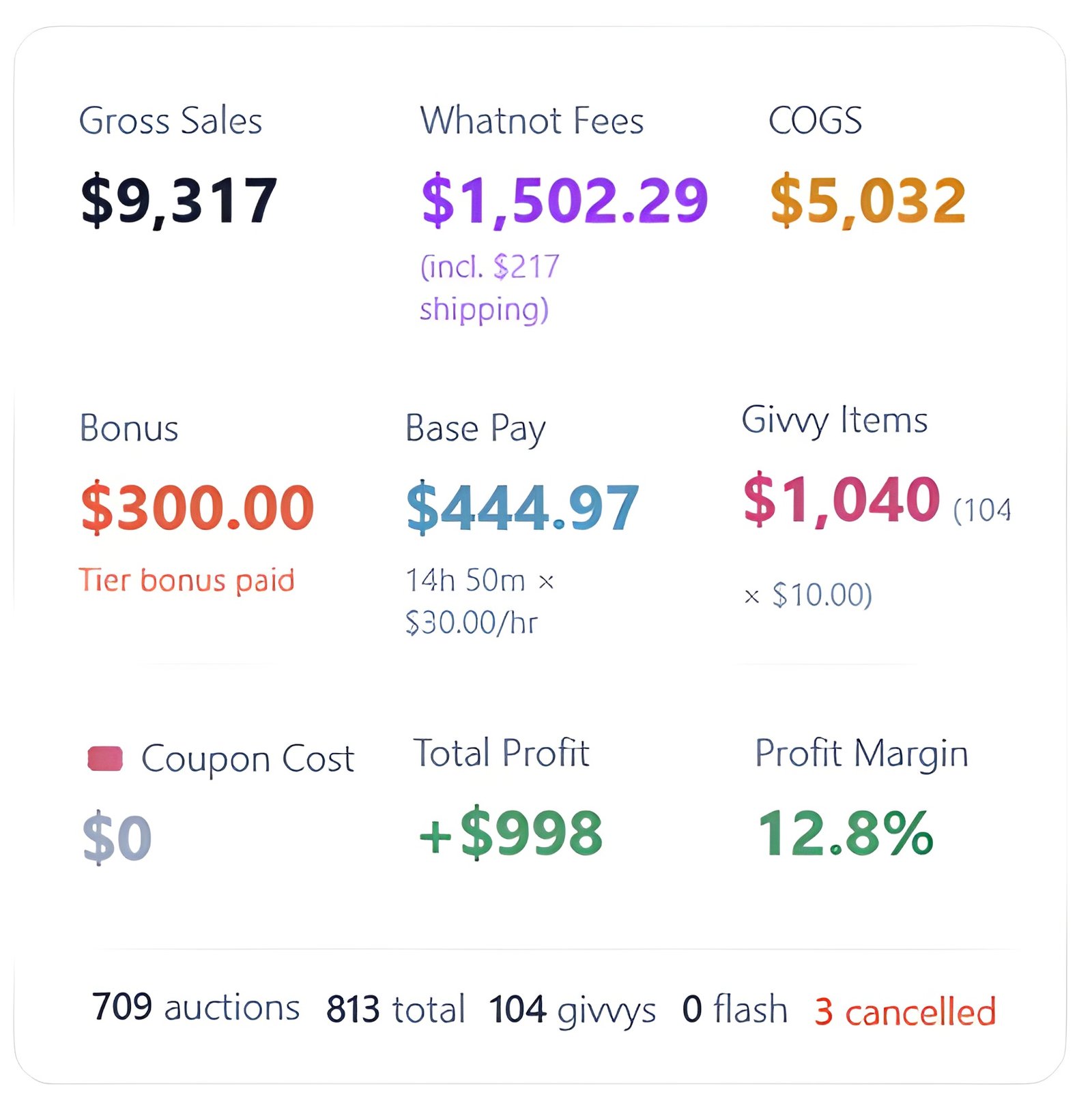 StreamVoya syncs your Whatnot sales and calculates true profit per item, per stream, per day, and per streamer—factoring in fees, COGS, labor, commissions, giveaways, and bonuses. and so much more!