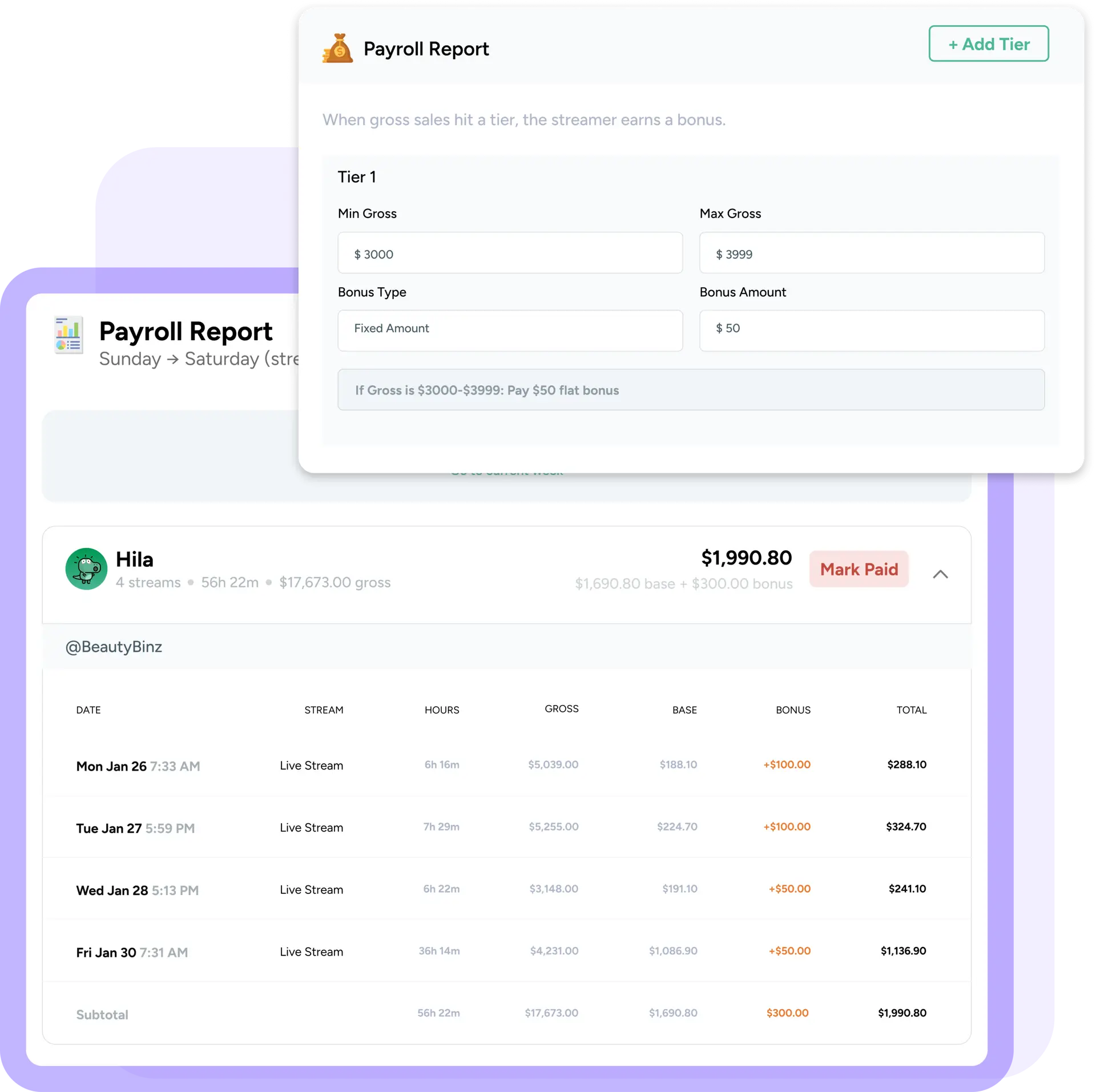 Track hours, commissions, targets, and bonuses in real time, with payroll reports auto-generated instantly every pay period.